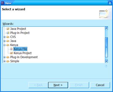 Inside Eclipse select the menu item File > New > Other to open the New wizard. Select Kenya File in the Kenya folder then click Next.