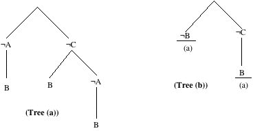 The trees in Figures (a) and (b) are very similar to execution trees of a logic program and this is the key to the method. If, for the moment, you ignore the atom B in clauses (1) and (2) they become Horn clauses and the tree in (a) is exactly the proof tree for the query "show A and C". Introducing B back into clauses (1) and (2) the proof tree can be viewed as a proof of the clause B or B, which is equivalent to B. The tree in (b) is the proof tree for "show B and C", where B is treated as a fact.