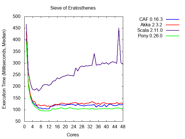 The Savina benchmark suite is a widely accepted collection of benchmark programs that has been developed specifically for actor-oriented programs and languages [Source]. The goal was to provide a suite that is “diverse, realistic and represents compute (rather than I/O) intense applications” [Source]. Here available are the results of the individual Savina programs, executed on 2x Intel(R) Xeon(R) CPU E5-2690 v3 2.6 GHz (2 sockets, 24-core +HT) with 256 GB RAM. Pony 0.26.0 vs. Akka 2.3.2 vs. Scala 2.11.0 on JVM 1.8.0-161 vs. CAF 0.16.3 (GCC 7.3.1)